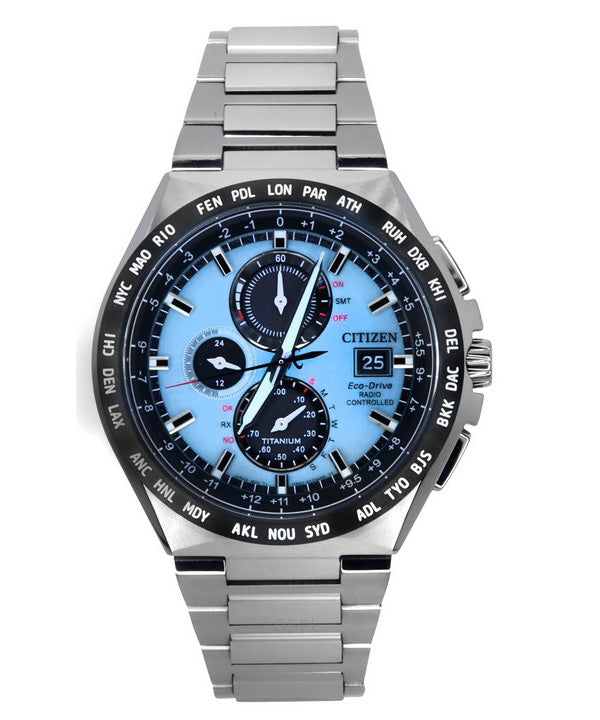 Montre pour homme Citizen Eco-Drive GMT avec chronographe radiocommandé en titane avec cadran bleu clair AT8238-84M 100M