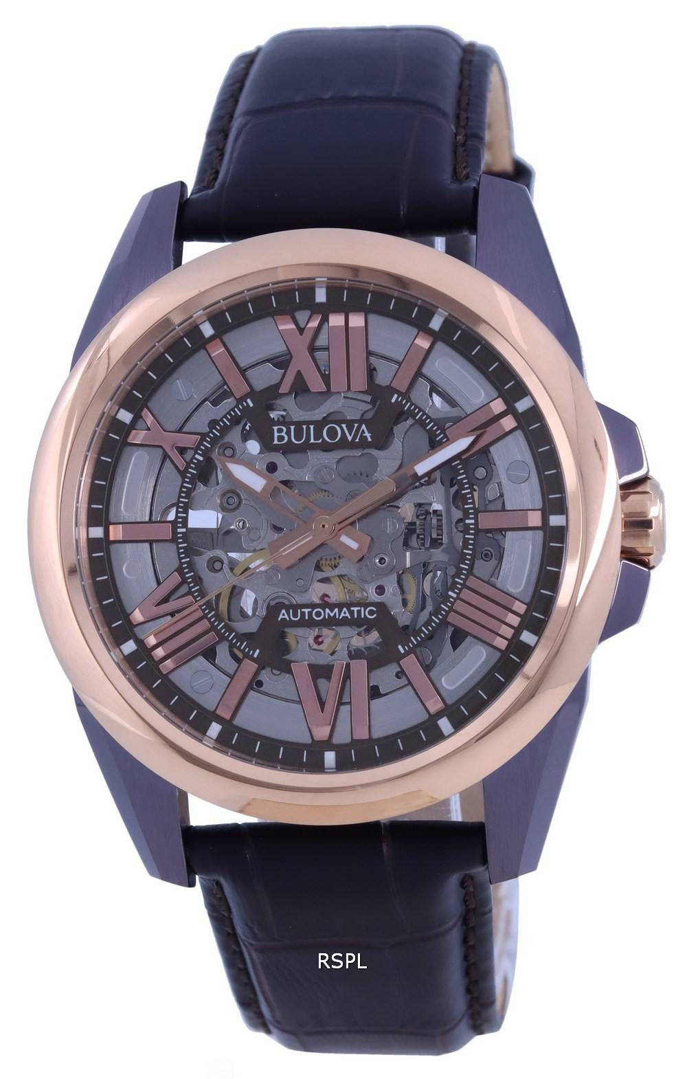 Montre pour homme Bulova Classic Skeleton Silver Dial Bracelet en cuir automatique 98A165 100M