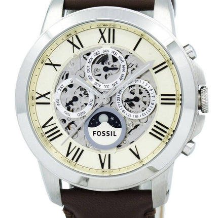 Accorder des fossiles montre automatique cadran squelette blanc en cuir brun ME3027 masculin