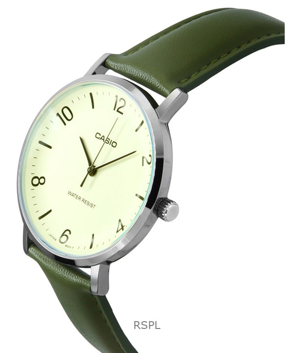 Montre analogique Casio Standard pour homme, bracelet en cuir vert, cadran blanc, quartz, MTP-VT03L-7B