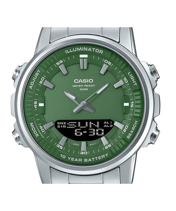 Montre analogique numérique Casio en acier inoxydable avec cadran vert et quartz AMW-880D-3AV pour homme
