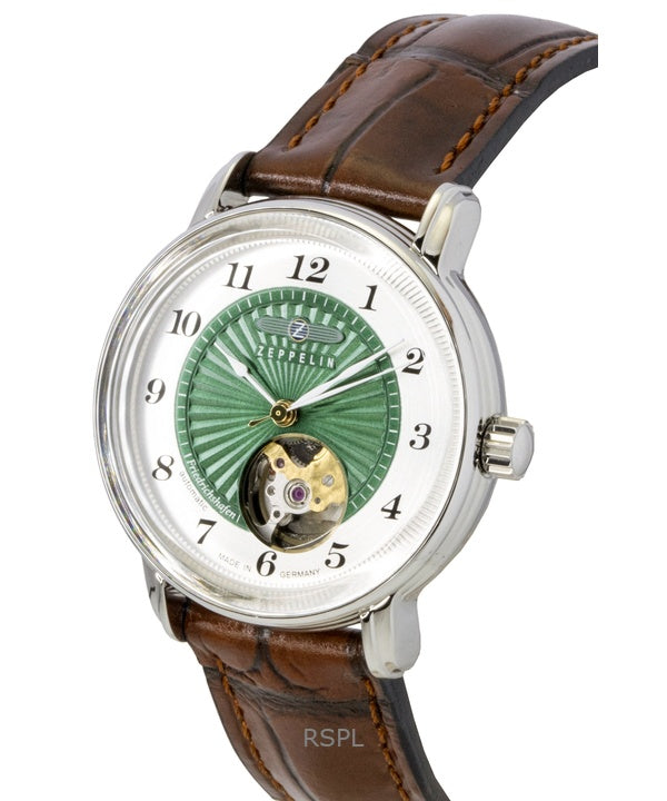 Montre automatique pour femme Zeppelin Friedrichshafen, bracelet en cuir, cœur ouvert, cadran vert, modèle 85672