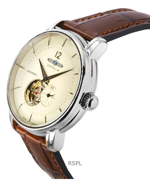 Montre automatique pour homme Zeppelin LZ-120 Bodensee avec bracelet en cuir beige et cadran en forme de cœur ouvert 81661