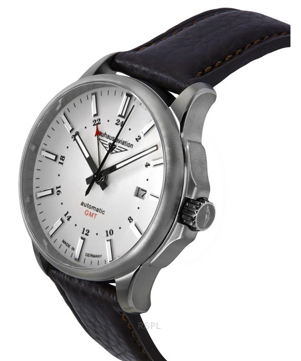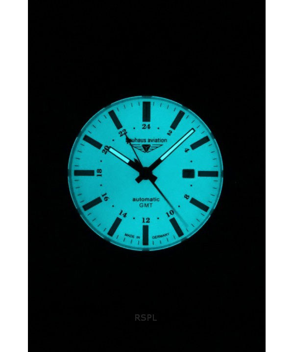 Montre Bauhaus Aviation GMT pour homme avec bracelet en cuir et cadran beige entièrement lumineux, automatique, 28685, 100 m
