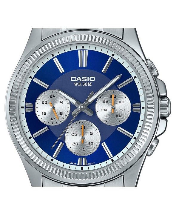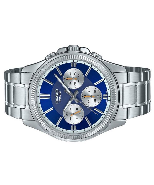 Montre Casio Enticer analogique en acier inoxydable avec cadran bleu et quartz MTP-1375D-2A1 pour homme