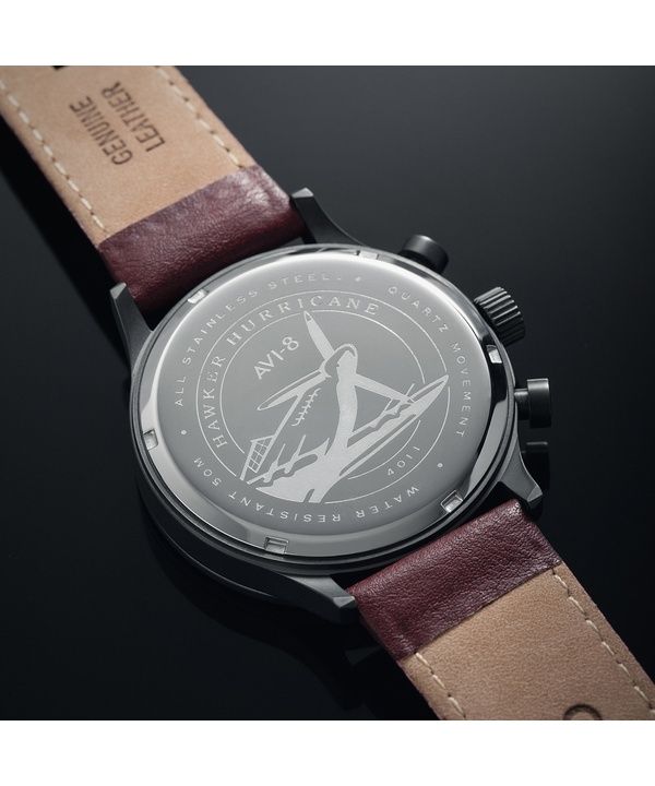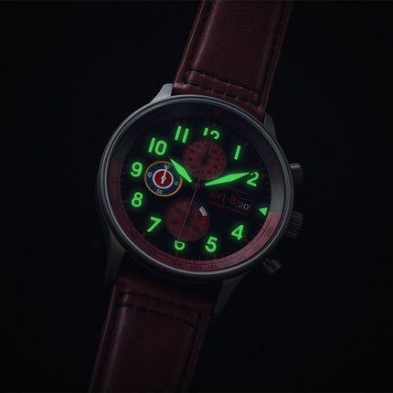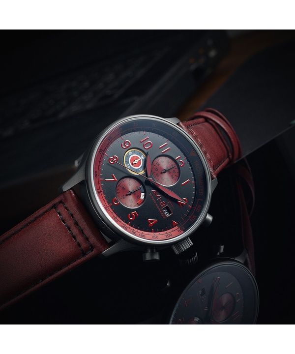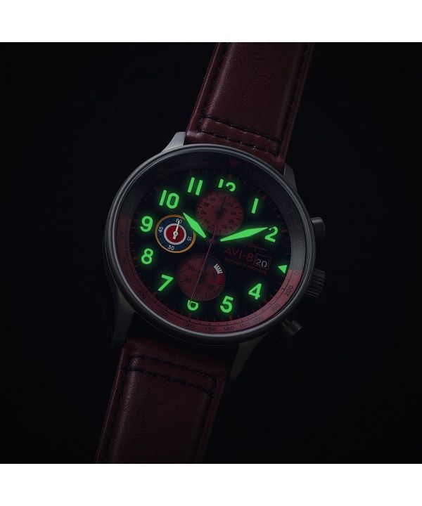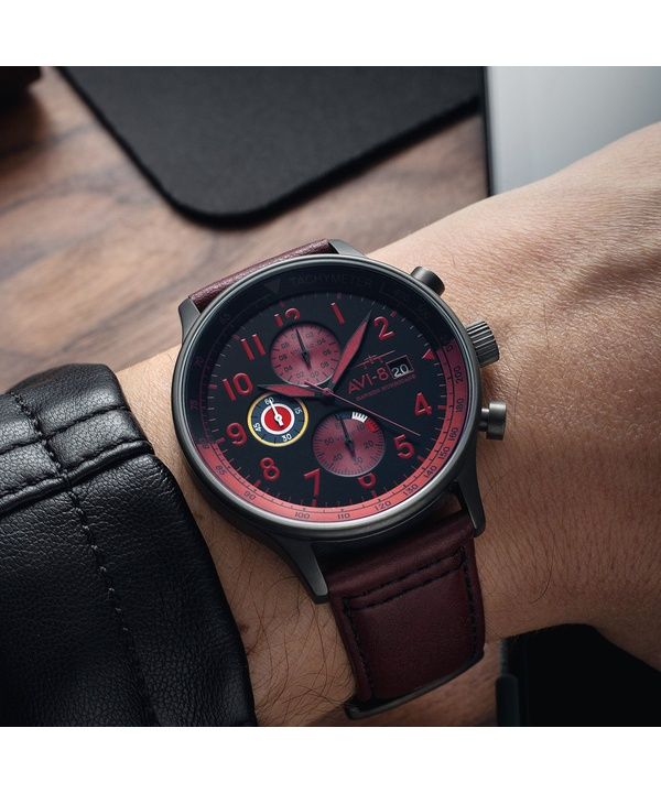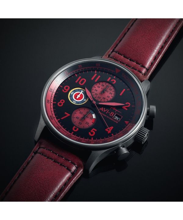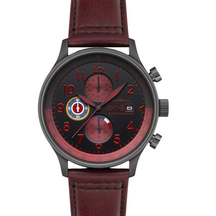 Montre chronographe classique Hawker Hurricane AVI-8 pour homme avec bracelet en cuir rouge sang et cadran noir à quartz AV-4011