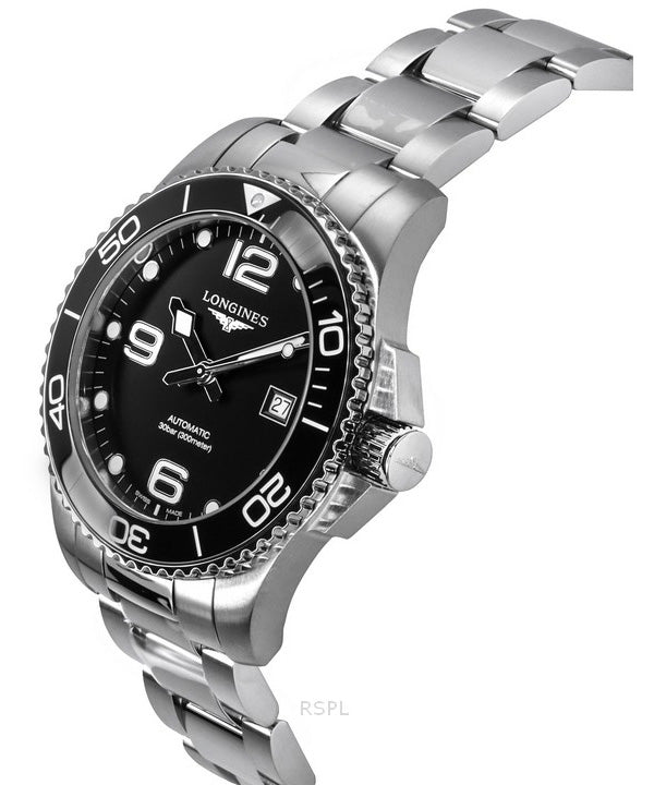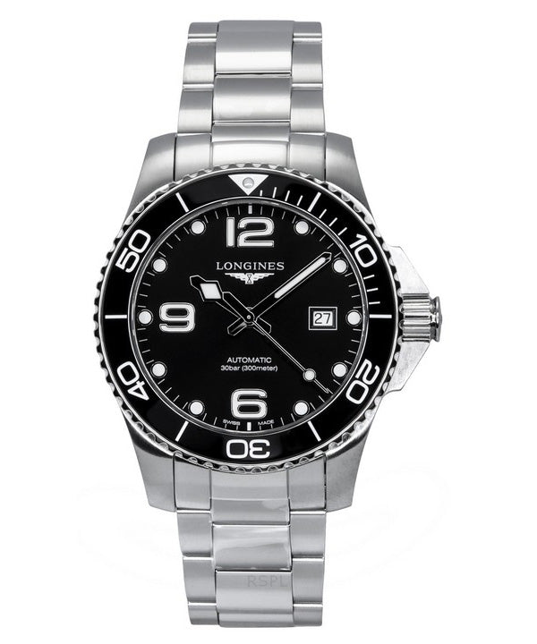 Montre de plongée automatique Longines Hydroconquest en acier inoxydable avec cadran noir et rayons de soleil L3.782.4.56.6 300M