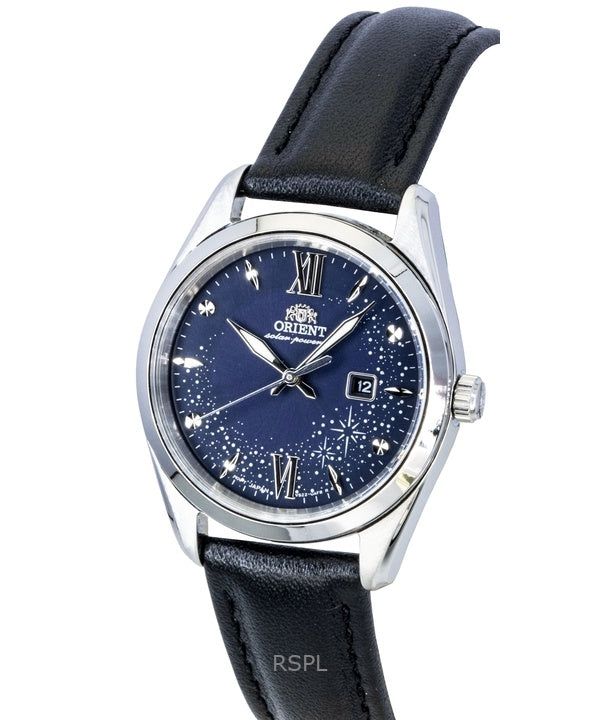 Montre femme Orient Stretto à bracelet en cuir, cadran bleu et énergie solaire RA-WG0605L
