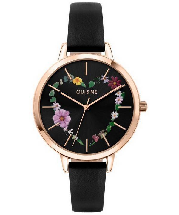 Montre Femme Oui &, Me Grande Fleurette Cadran Noir Bracelet Cuir Quartz ME010030