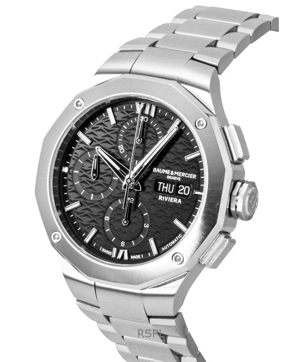 Montre homme Baume & Mercier Riviera Chronographe, boîtier en acier inoxydable, cadran noir, automatique, référence M0A10825, étanche à 100 m