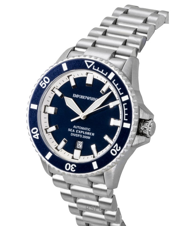 Montre homme Emporio Armani Sea Explorer en acier inoxydable, cadran bleu, automatique, étanche à 200 m (AR60087).