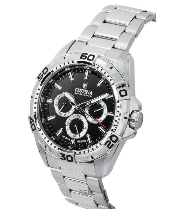Montre homme Festina multifonction en acier inoxydable, cadran noir, quartz F20623-4, 100 m