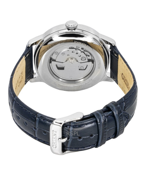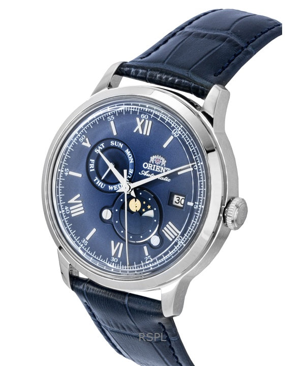 Montre homme Orient Classic Soleil et Lune, bracelet en cuir, cadran bleu marine, automatique RA-AK0806L