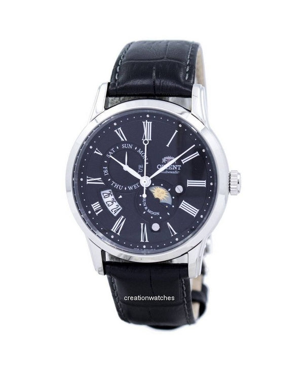 Montre homme Orient Sun And Moon avec bracelet en cuir et cadran noir SAK00004B automatique reconditionnée