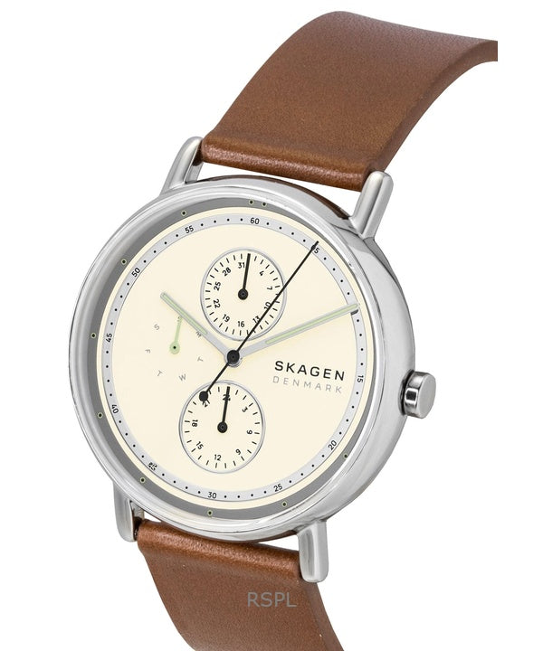 Montre homme Skagen Signature à bracelet en cuir, cadran crème multifonction, mouvement à quartz SKW6942