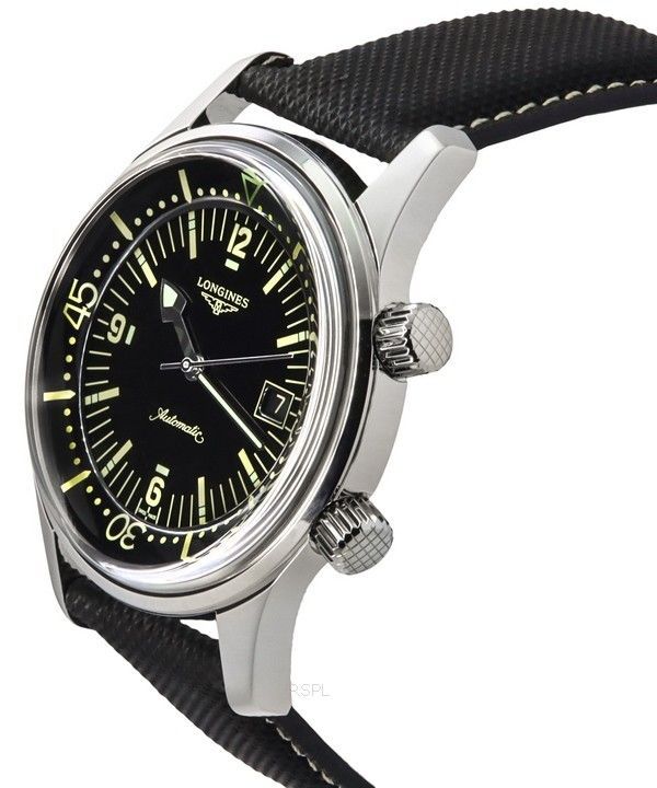 Montre Longines Legend Diver avec bracelet en cuir et cadran noir automatique L3.774.4.50.0 300M pour homme