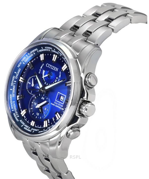 Montre pour homme Citizen Eco-Drive Calendrier perpétuel GMT Chronographe en acier inoxydable Cadran bleu AT9120-89L 200M