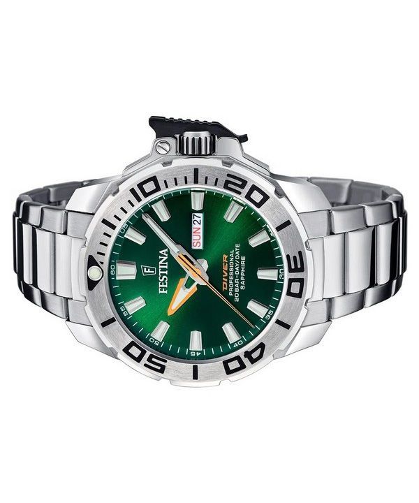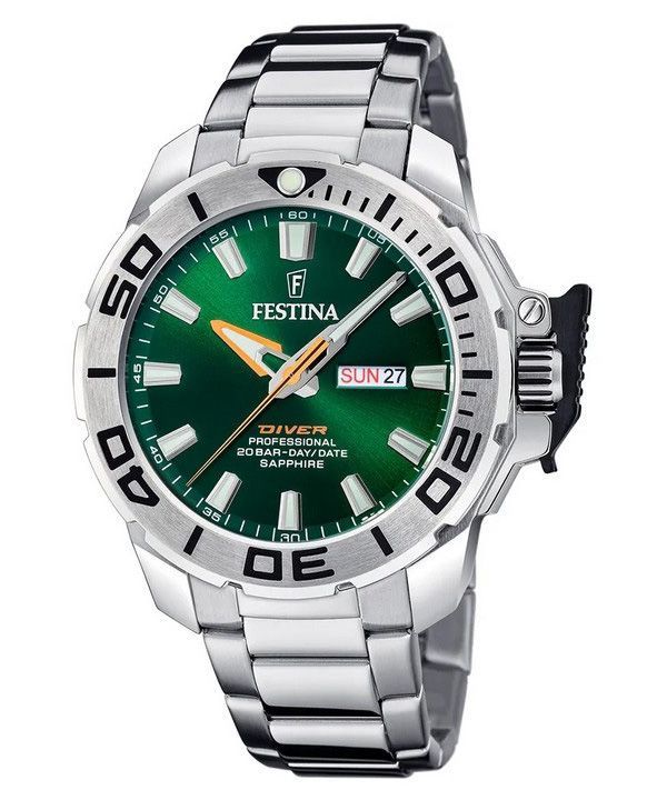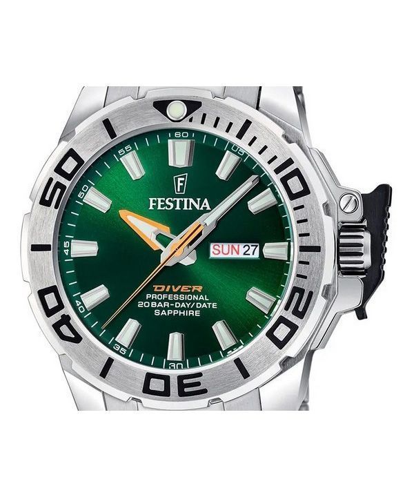 Montre pour homme Festina Diver en acier inoxydable avec cadran vert et quartz F20665-2 200M avec bracelet supplémentaire