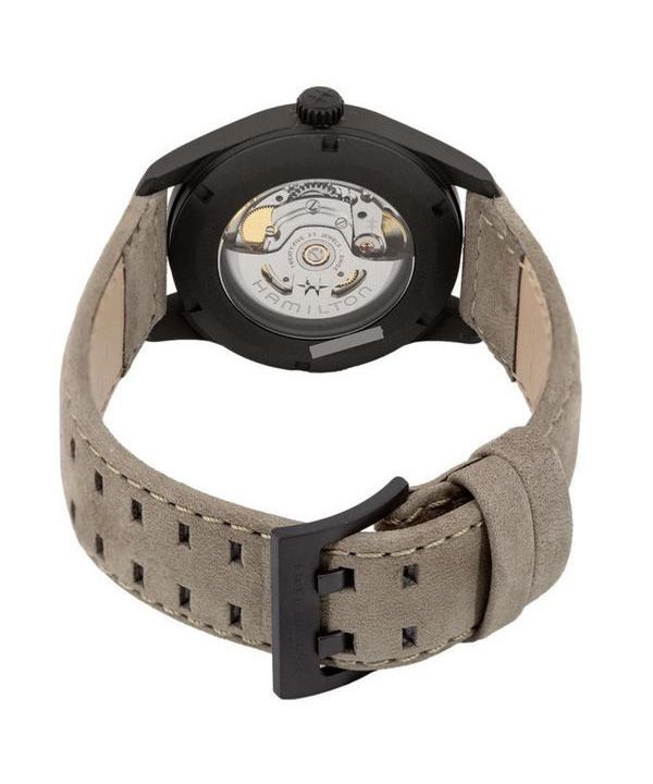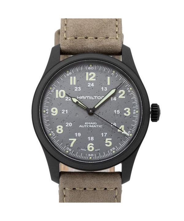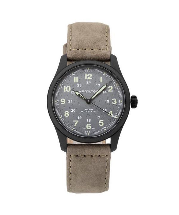 Montre pour homme Hamilton Khaki Field avec bracelet en cuir titane et cadran gris automatique H70215880 100M