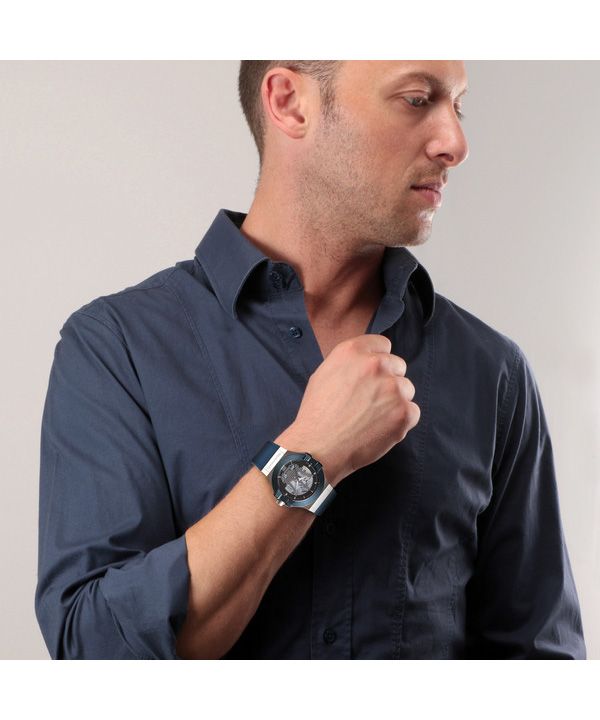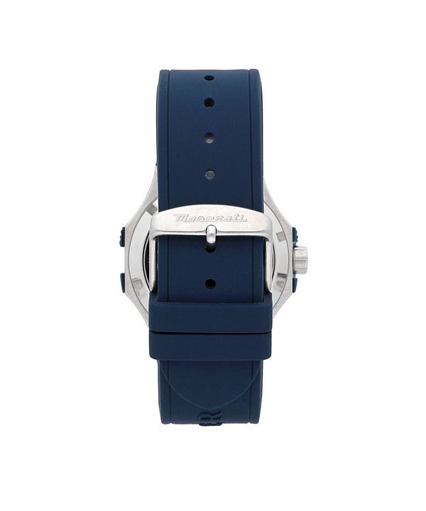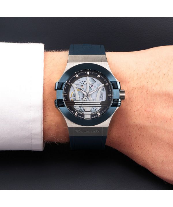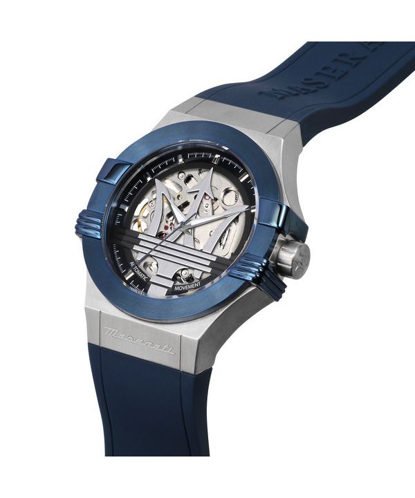 Montre pour homme Maserati Potenza avec bracelet en caoutchouc bleu et cadran squelette argenté automatique R8821108035 100M